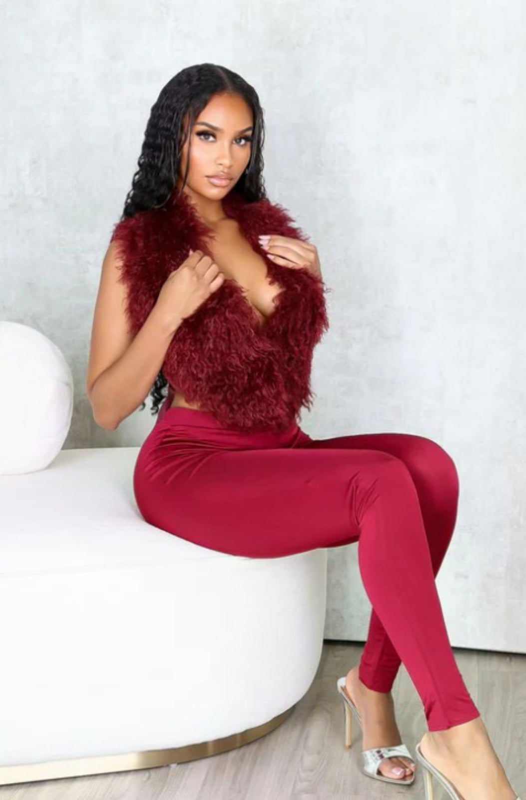 Open back faux fur top and leggings set -color wine 95% polyester 5% spandex